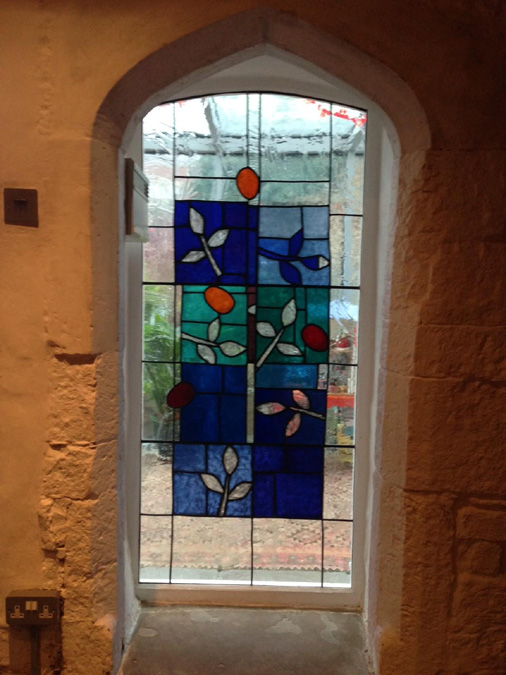 arched stone doorway (above right), which now contains a leaded glass panel,