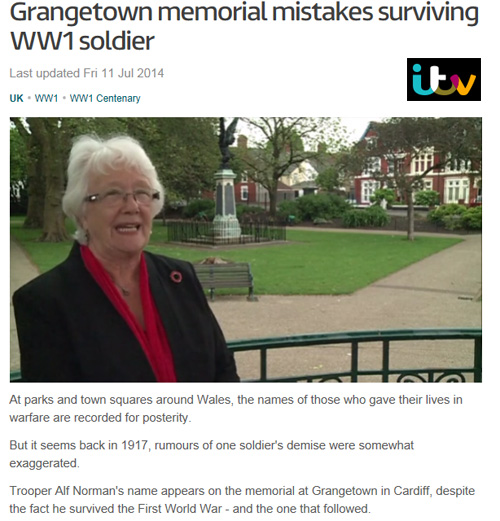 ITV Wales featured the story of Alf Norman and the Grangetown memorial in July, interviewing Zena Mabbs and Rita Spinola from the history society.