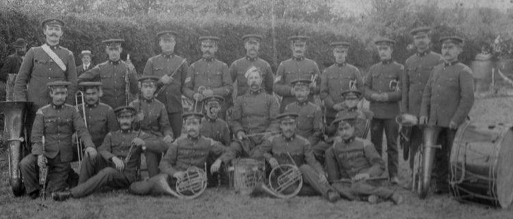 Alf played in the band of the Welsh Regiment, as well as with the Post Office in civilian life. He is standing on the far right, next to the drum.